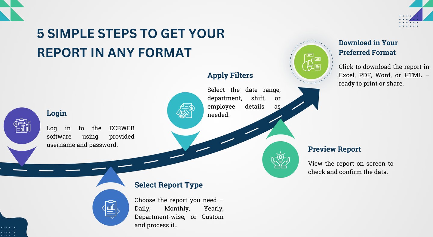 Download reports in Excel, Word, PDF, or HTML โ company-wise, department-wise, or period-wise.